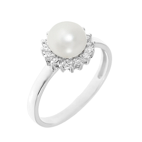 Кольцо из серебра 925 пробы с жемчугом культивированным и фианитом, покрытие: Родий. Средний вес изделия 2,5 гр.