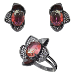 Комплект "Эльвира" фианит "турмалин"красно - зеленый, черная эмаль, размеры кольца: 17, 18, 19, 20