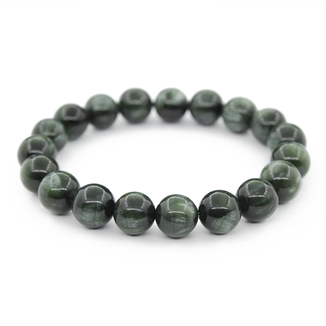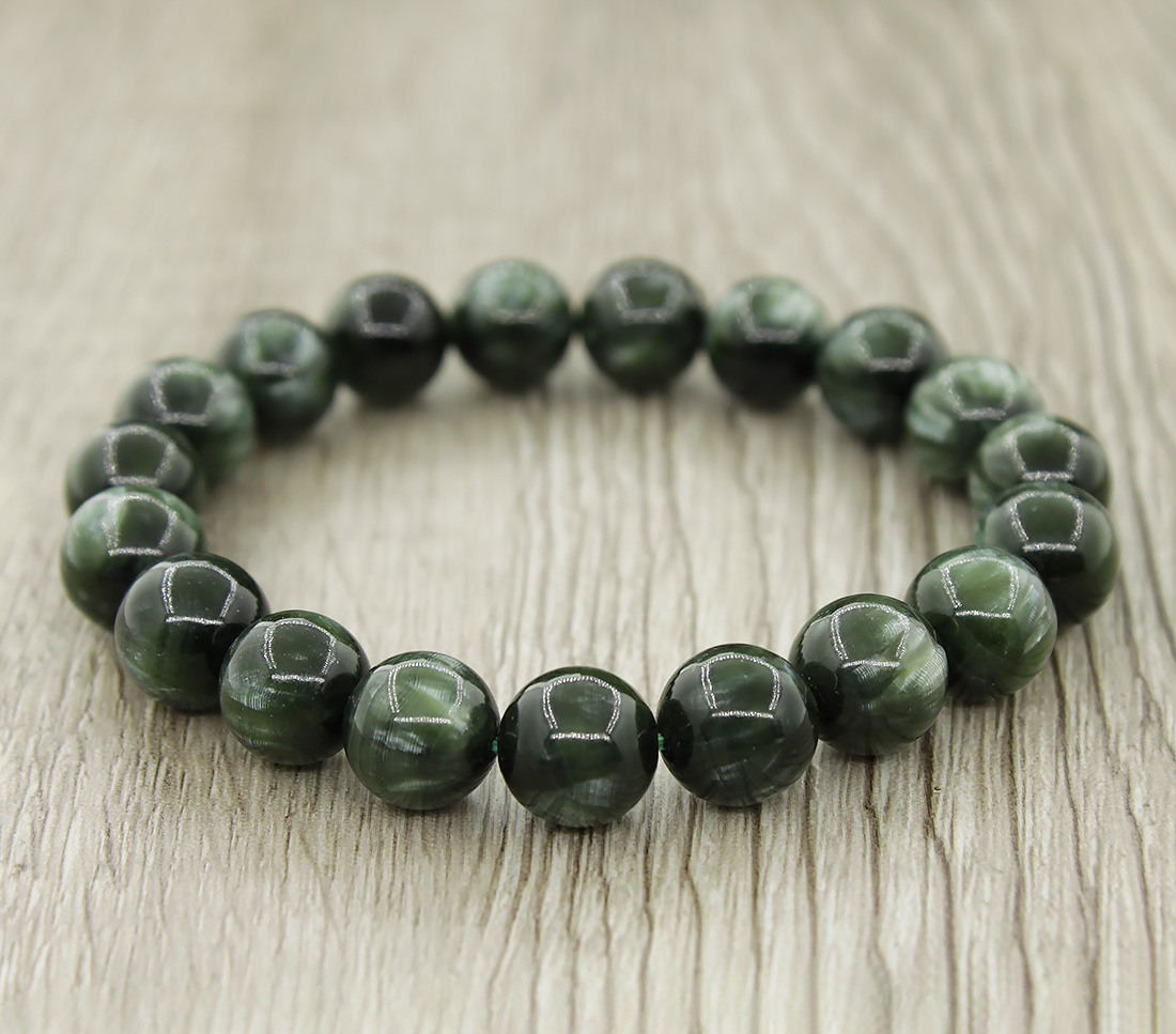 Стильный браслет из натурального серафинита дополнит Ваш повседневный или праздничный образ. Диаметр бусин 10мм. Длина браслета 18см.