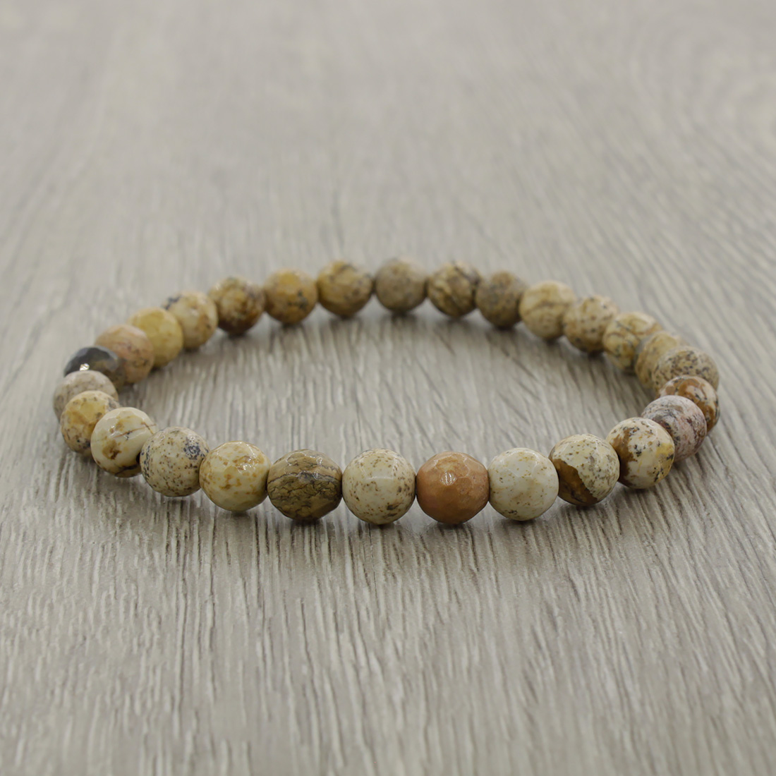 Изящный браслет из граненых шариков натуральной древесной яшмы. Бусинки нанизаны на прочную резинку, что позволяет с комфортом надевать и снимать украшение. Диаметр шарика 6мм. Длина 18см.