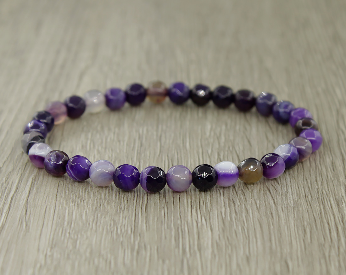 Изящный браслет из граненых шариков натурального фиолетового агата. Бусинки нанизаны на прочную резинку, что позволяет с комфортом надевать и снимать украшение. Диаметр шарика 6мм. Длина 18см.