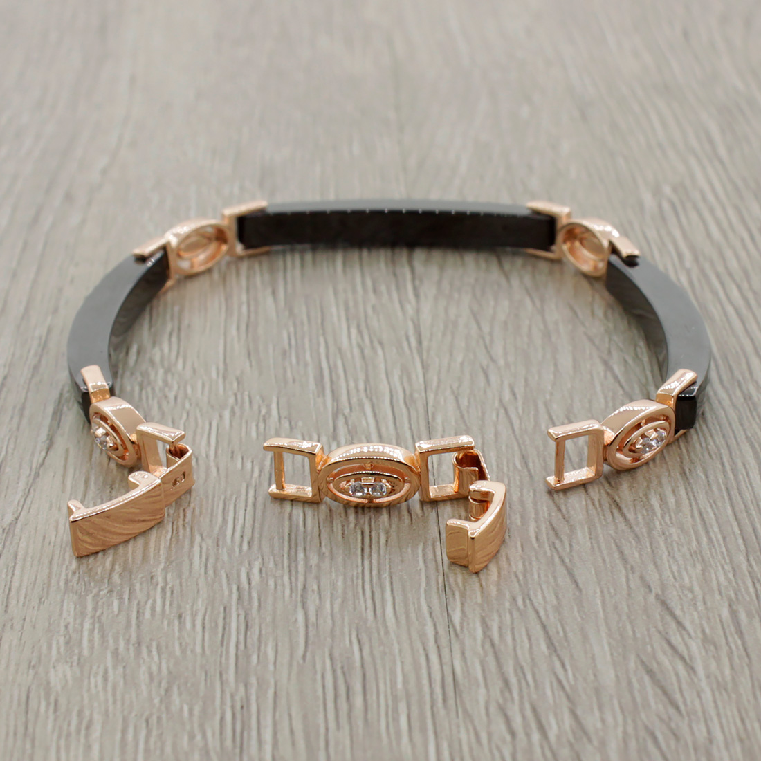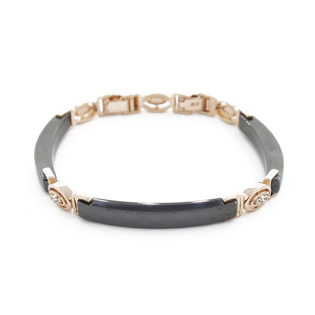 Браслет из натуральной керамики со вставками из фианитов. Звенья соединяются с помощью вставок из ювелирного сплава "под золото" и имеет дополнительное съемное звено. Длина изделия 16см, с дополнительным звеном 18см. Размер звена 35х4мм.