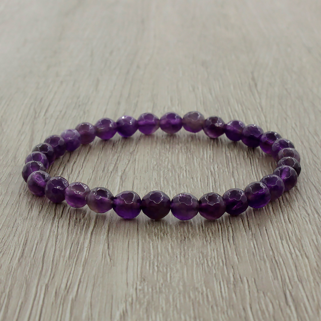Изящный браслет из граненых шариков натурального аметиста. Бусинки нанизаны на прочную резинку, что позволяет с комфортом надевать и снимать украшение. Диаметр шарика 6мм. Длина 18см.