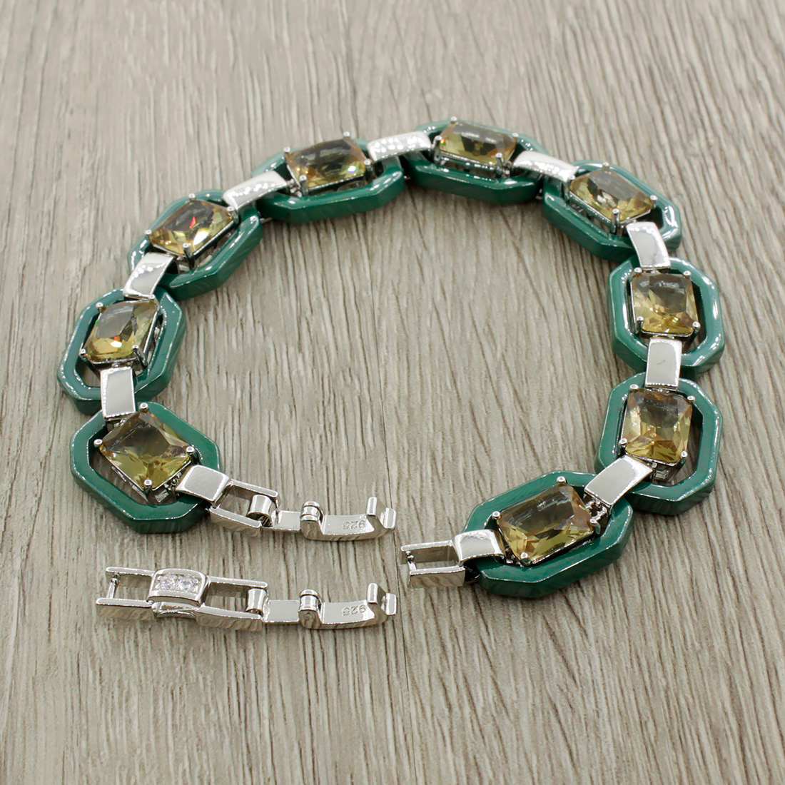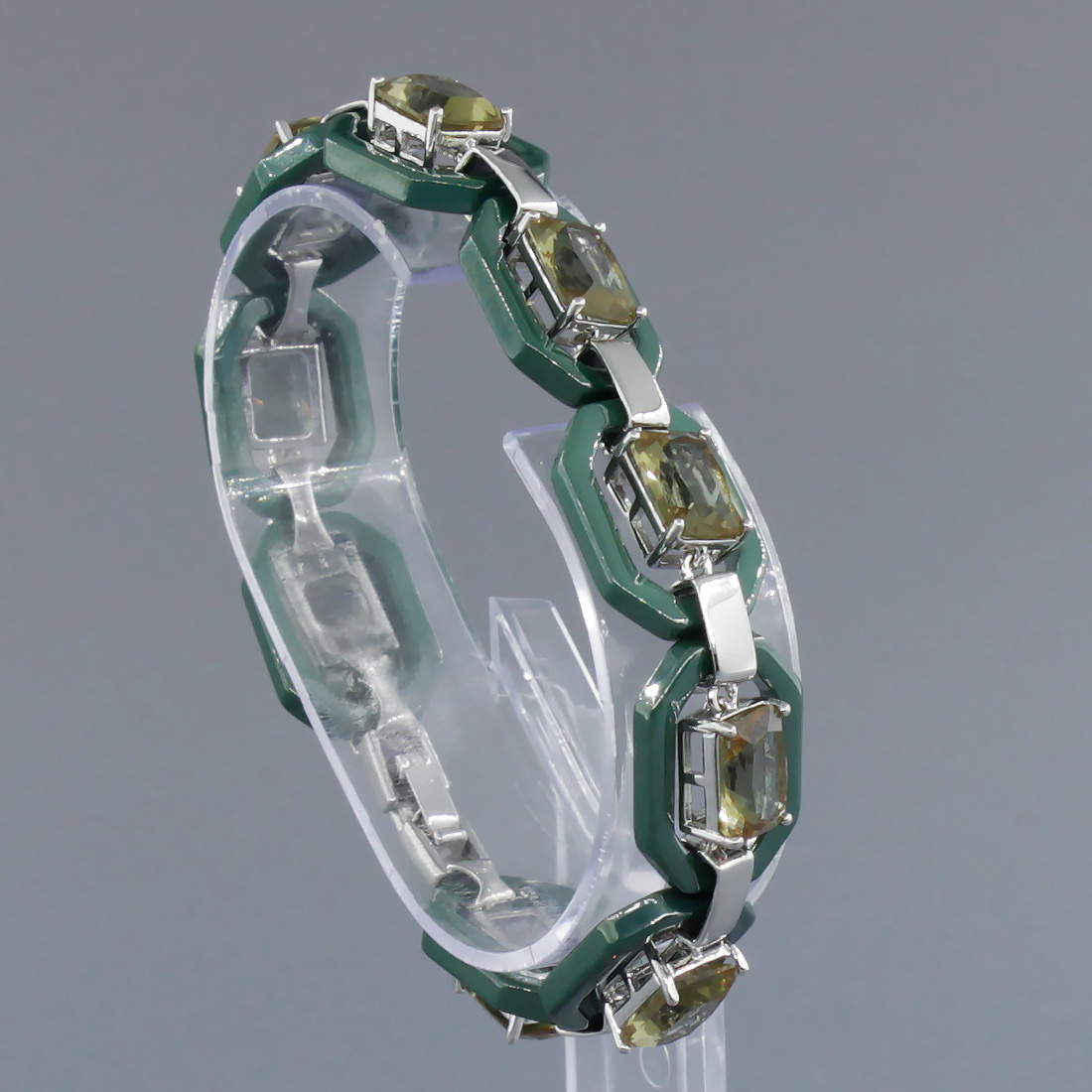 Браслет "Октагон" из зеленой керамики с Султанитом покрытие светлый металл, длина 18см