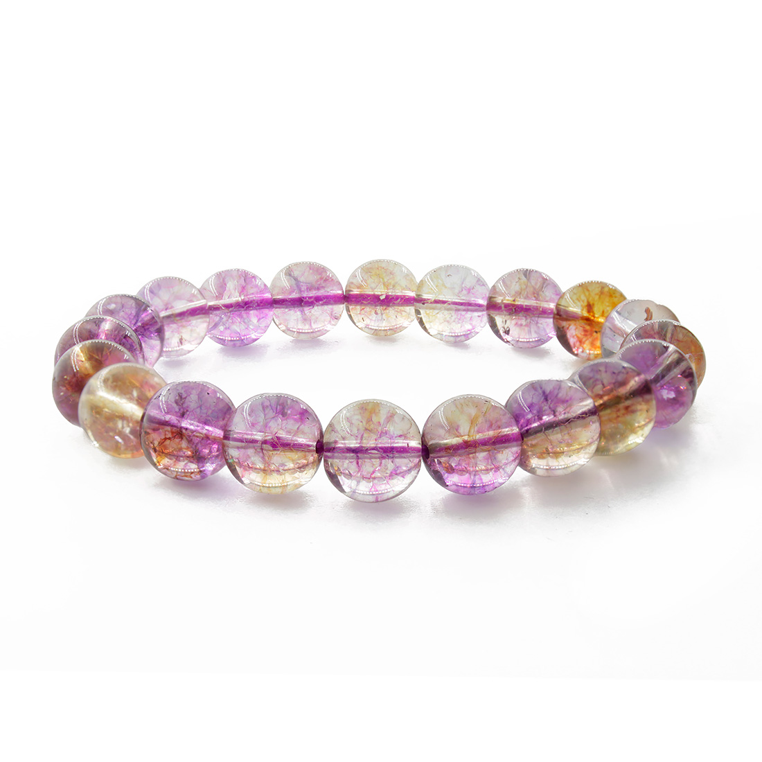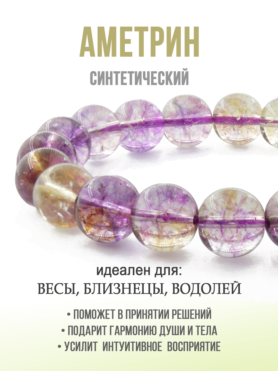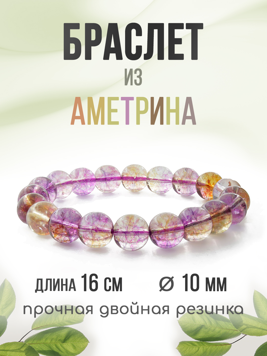Браслет выполнен из искусственного аметрина, на резинке. Диаметр бусин 10мм. Длина 17см.