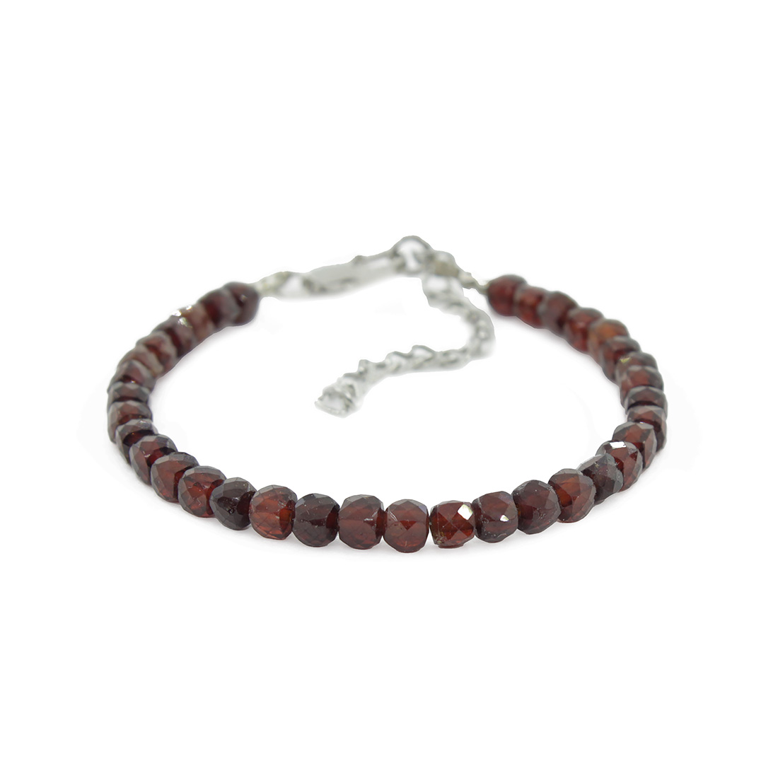 Браслет выполнен из природного граната-альмандина (Индия). Огранка бусин в форме додекаэдра эффектно показывает рисунок камня. Ширина браслета 3,5мм, длину можно регулировать с 17 до 22см с помощью удлинняющей цепочки.