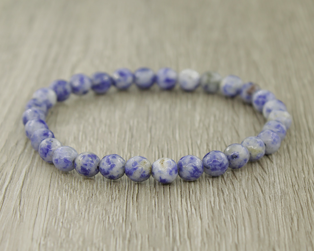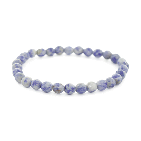 Изящный браслет из граненых шариков натурального содалита. Бусинки нанизаны на прочную резинку, что позволяет с комфортом надевать и снимать украшение. Диаметр шарика 6мм. Длина 18см.