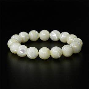Этот браслет сделан из шариков светлого перламутра. Браслет на резинке. Диаметр шарика 11мм. Длина браслета 16см.