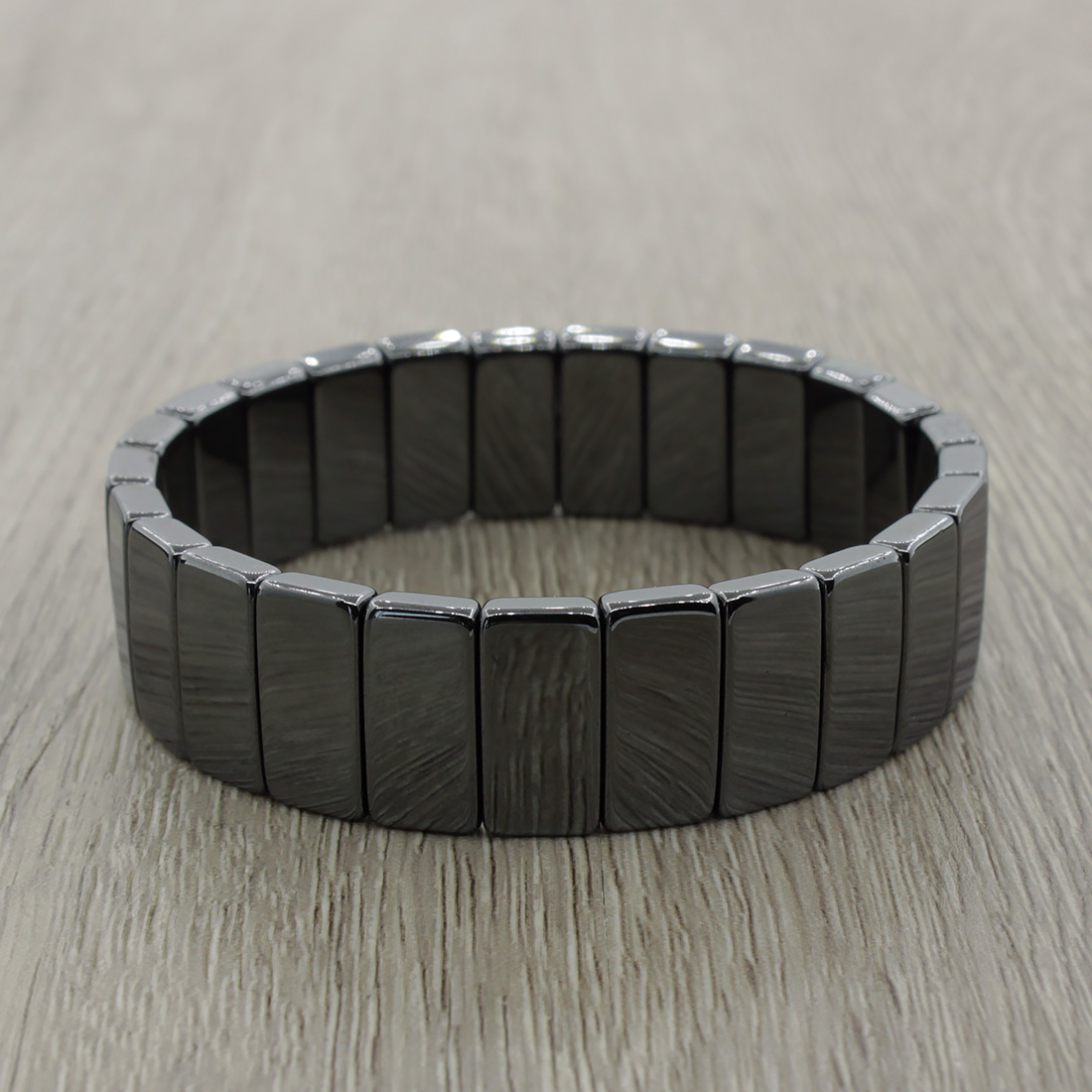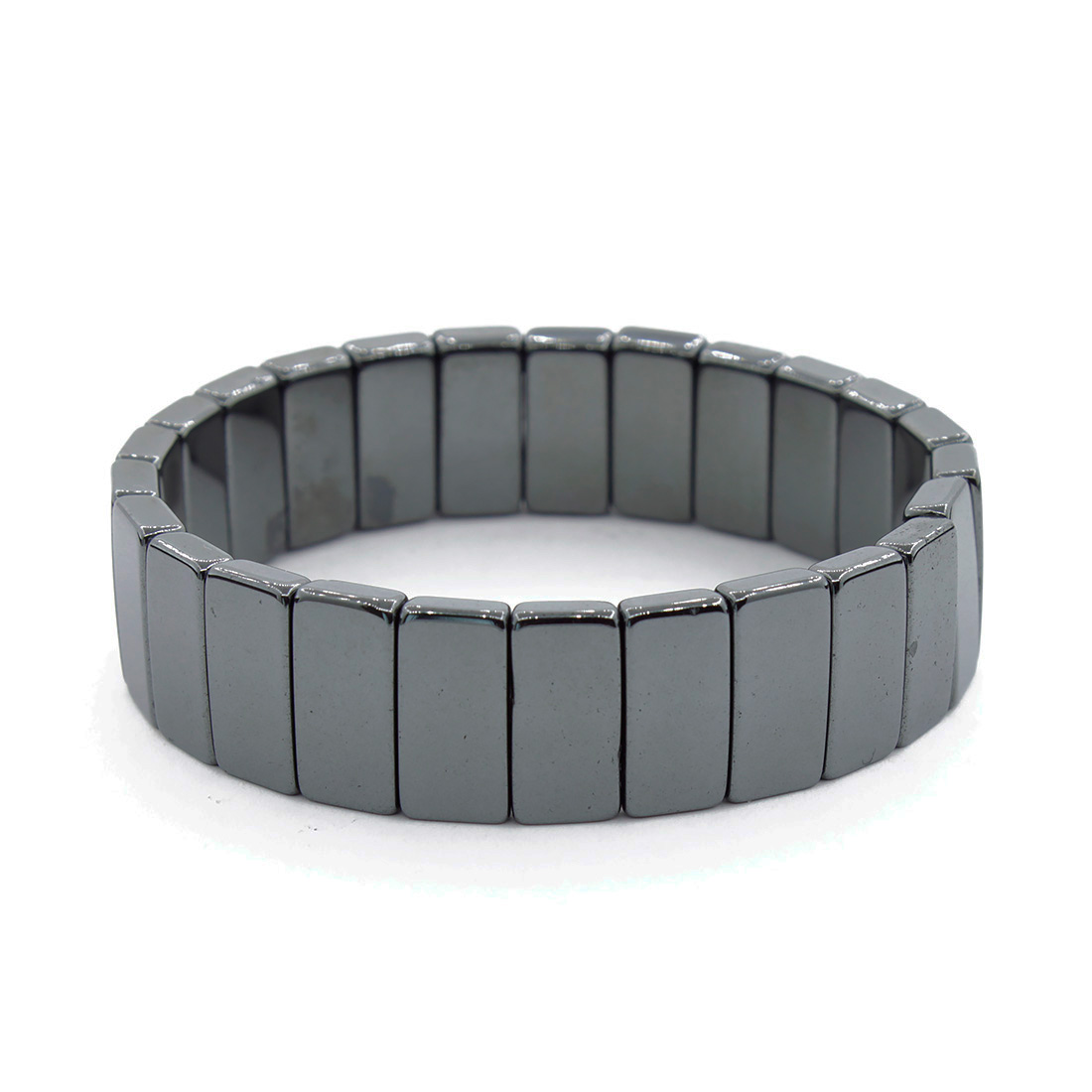 Браслет выполнен из натурального гематита на резинке. Имеет вручную отточенные прямоугольные звенья. Ширина браслета 16мм. Длина 17см.