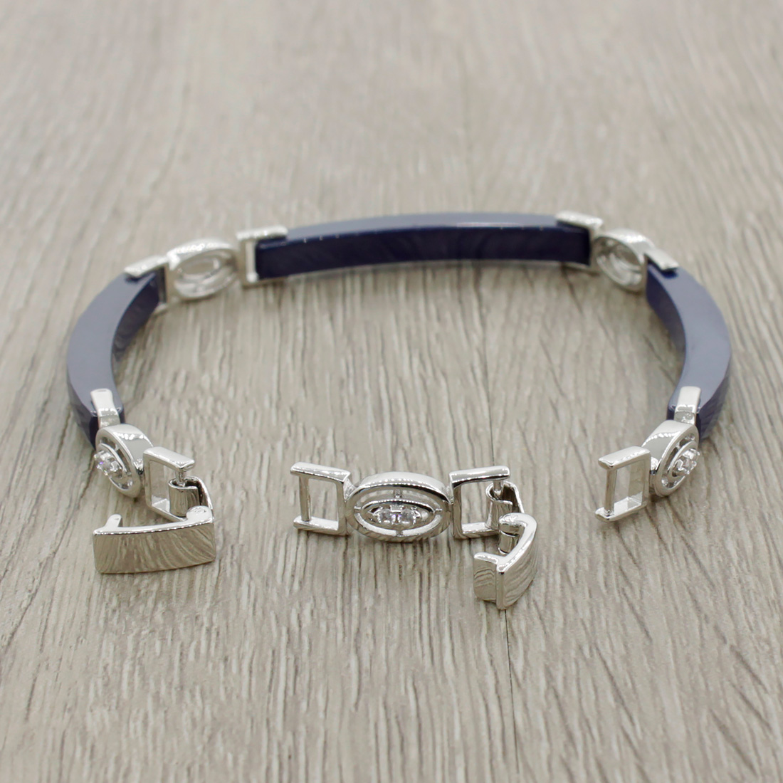 Браслет из натуральной керамики со вставками из фианитов. Звенья соединяются с помощью вставок из ювелирного сплава "под серебро" и имеет дополнительное съемное звено. Длина изделия 16см, с дополнительным звеном 18см. Размер звена 35х4мм.