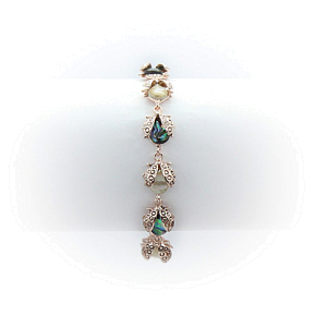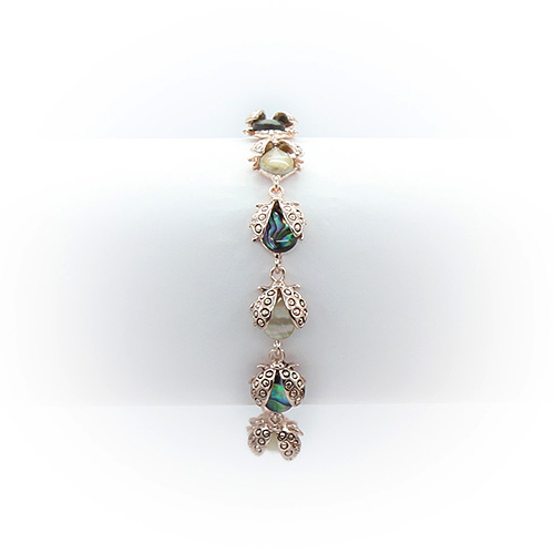 Необычный браслет выполненный из белого перламутра и гелиотиса в форме "Божьих коровок". Длина браслета 16-21см (регулируется с помощью удлинняющей цепочки). Ширина примерно 12мм.