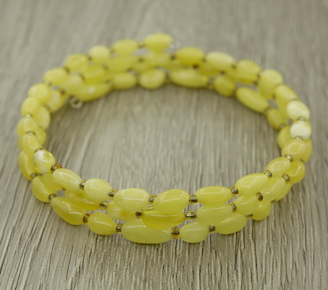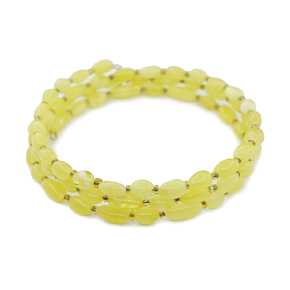 Янтарь молочный, галька овальная с бисером, браслет на спирали