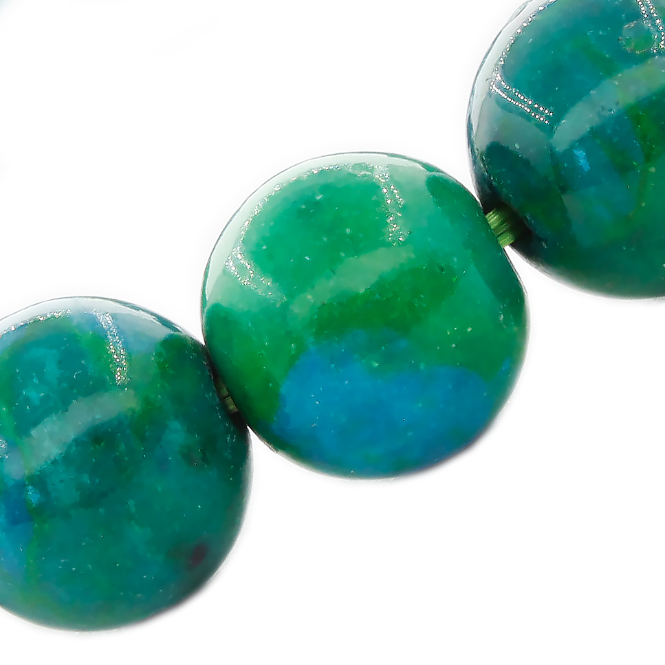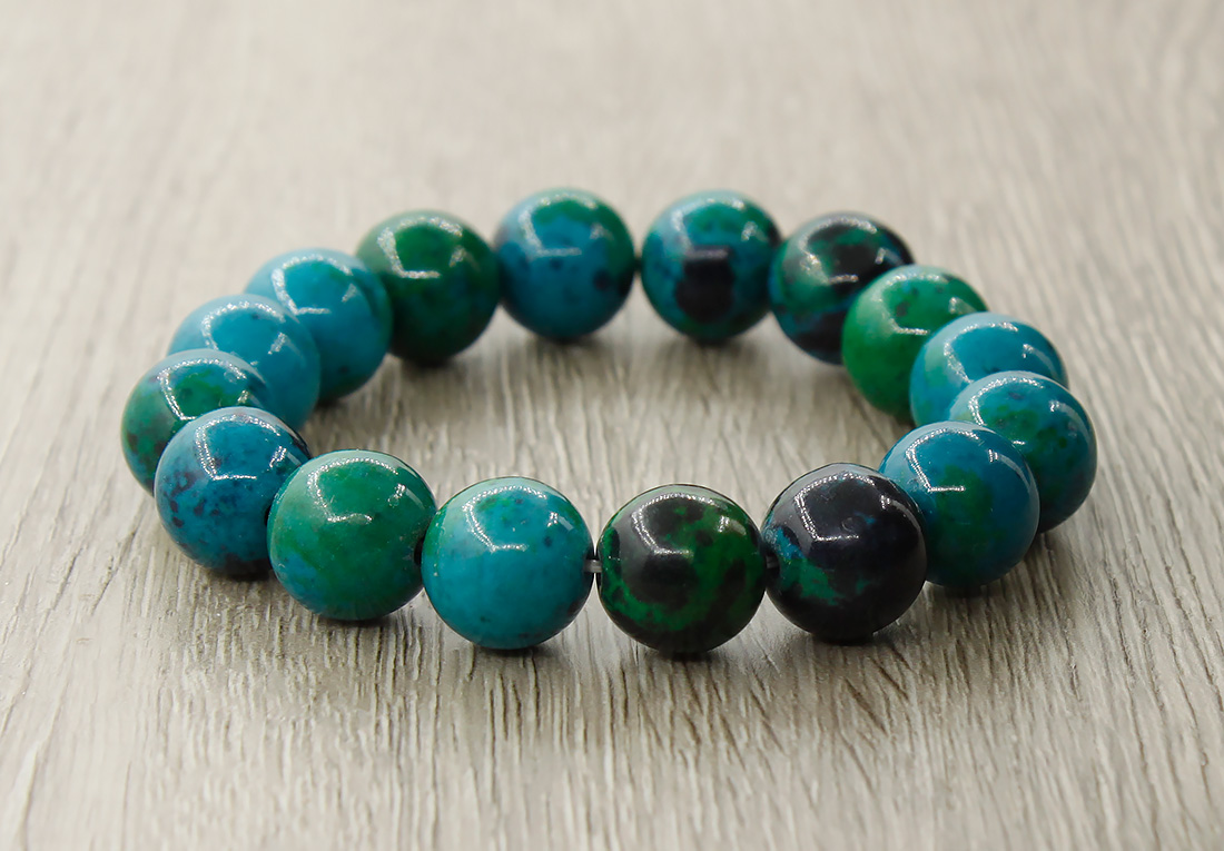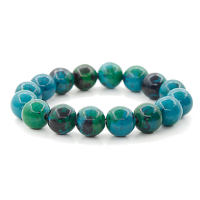 Браслет выполнен из камня хризоколла, на резинке. Диаметр шарика 12мм. Длина украшения 18см.