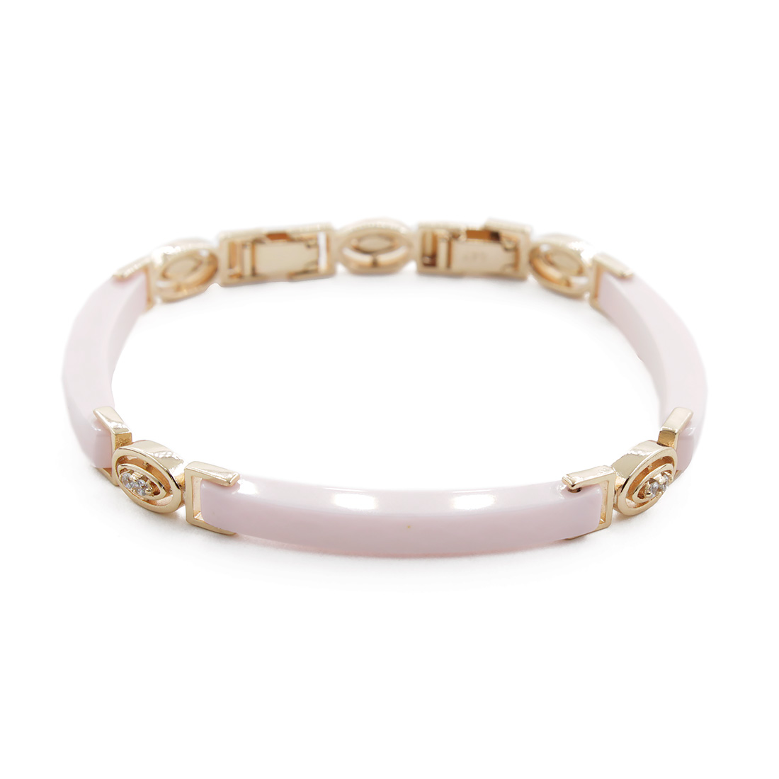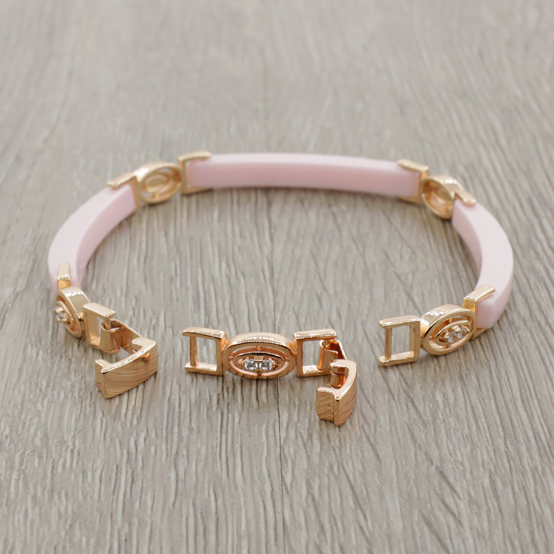 Браслет из натуральной керамики со вставками из фианитов. Звенья соединяются с помощью вставок из ювелирного сплава "под золото" и имеет дополнительное съемное звено. Длина изделия 16см, с дополнительным звеном 18см. Размер звена 35х4мм.