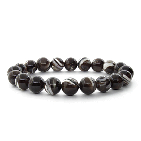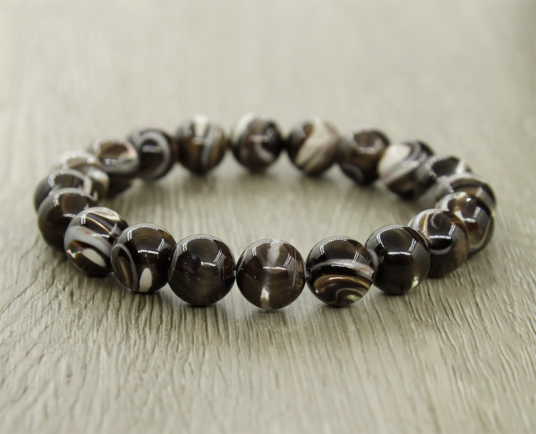Этот браслет сделан из шариков натурального перламутра чёрного цвета с белыми слоями. Браслет на резинке. Диаметр шарика 10мм. Длина браслета 17см.