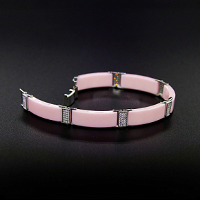 Очень привлекательный и стильный браслет из керамики светло-розового цвета с фианитами. Звенья соединяются с помощью вставок, покрытых родием и украшены фианитами. Длина браслета 18,5см. Ширина 0,8см