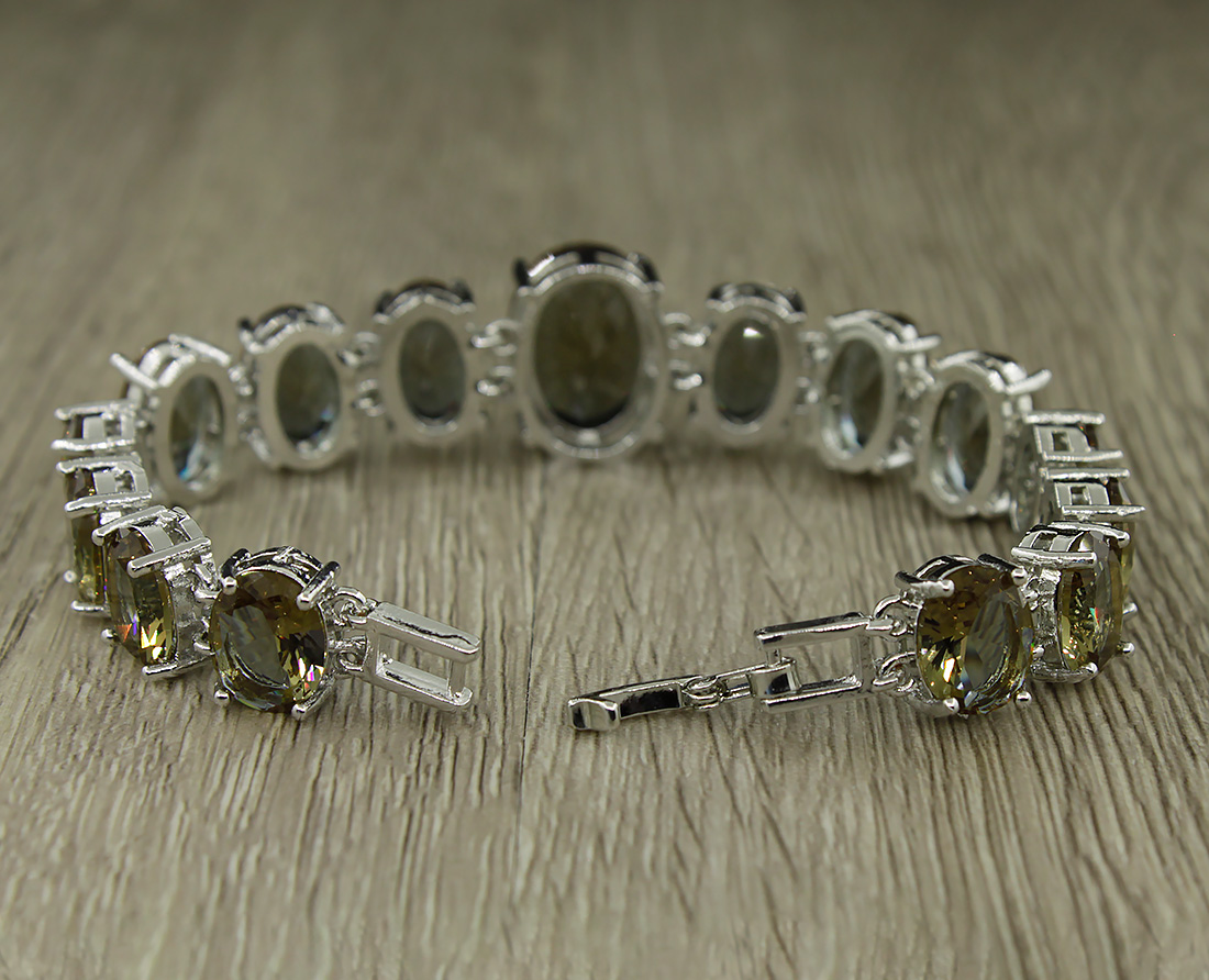 Стильный и изящный браслет с переливающимися султанитами. Благодаря огранке, вставки из султанита будут искриться на Вашем запястье. Длина браслета 16,5см. Размер большой вставки (по центру) 12х16мм, средних 8x12мм, малых 8x10мм.