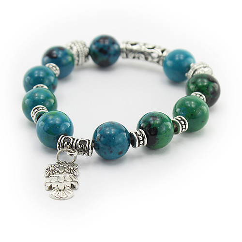 Браслет собран из камня хризоколла и разбавлен необычными вставками и подвеской "сова". Примерная длина браслета 19см. Диаметр 12мм.