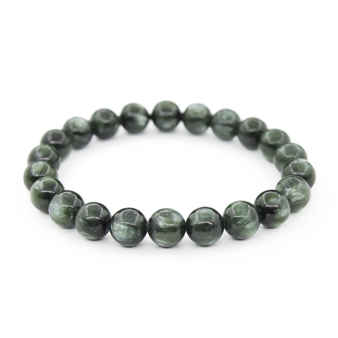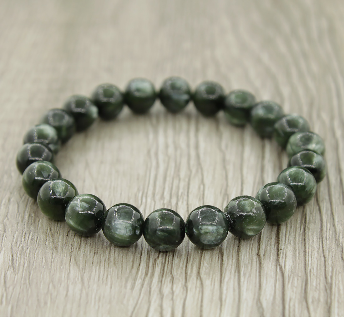 Стильный браслет из натурального серафинита дополнит Ваш повседневный или праздничный образ. Диаметр бусин 7мм. Длина браслета 18см.