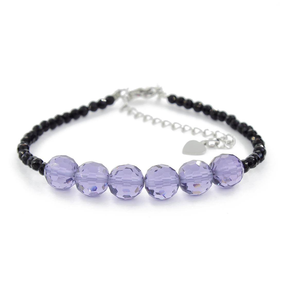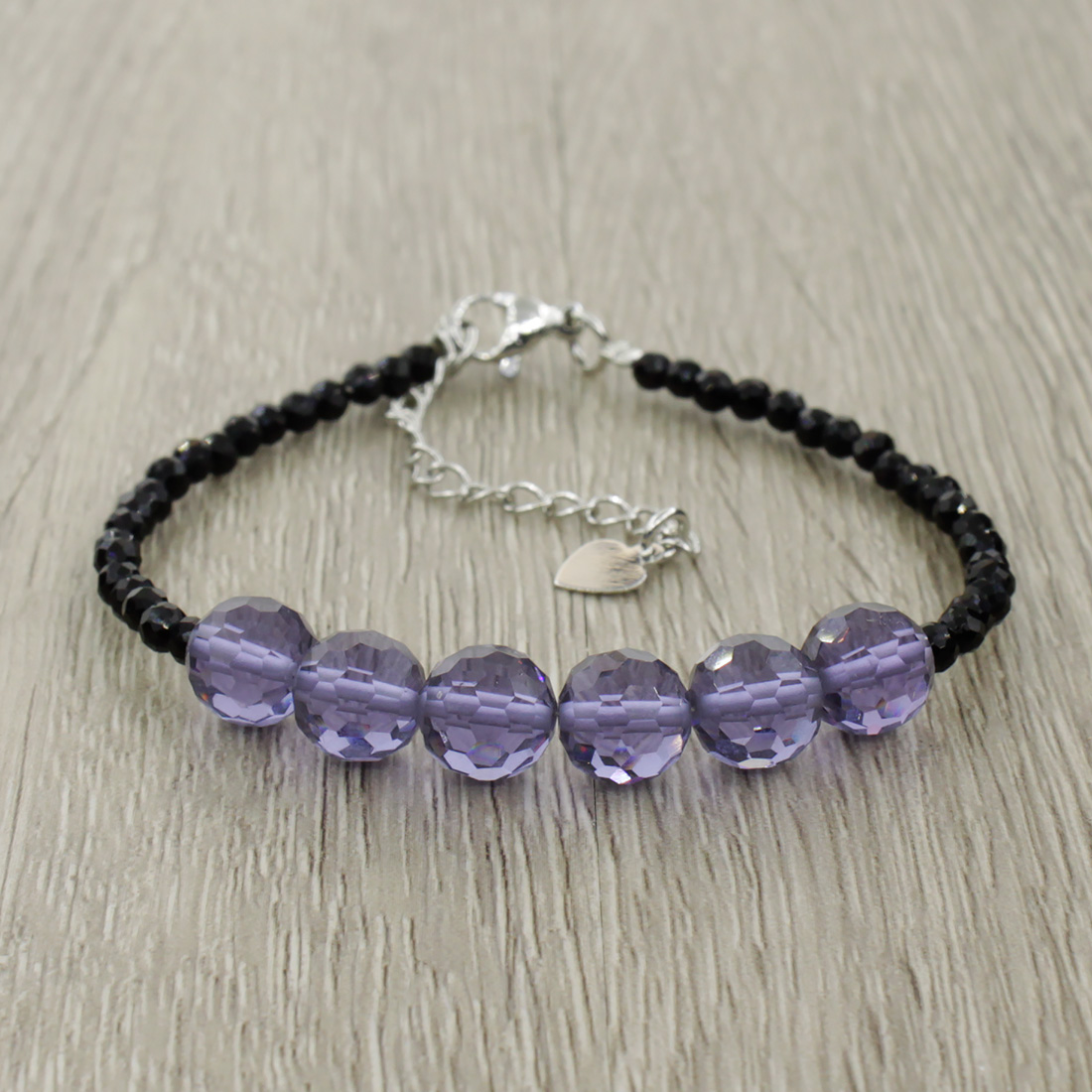Браслет выполнен из удивительного камня александрит, известный свойством менять окраску в зависимости от освещения: от фиолетовой до тёмной сине-зелёной. Переливы каждой грани бусины в сочетании с мелкими бусинками шпинели, придают украшению изумительное сияние. В то же время форма бусин - строгая, классическая. Диаметр бусин александрит 8мм, шпинели 3мм. Длина браслета 17...23см, регулируется удлиняющей цепочкой.