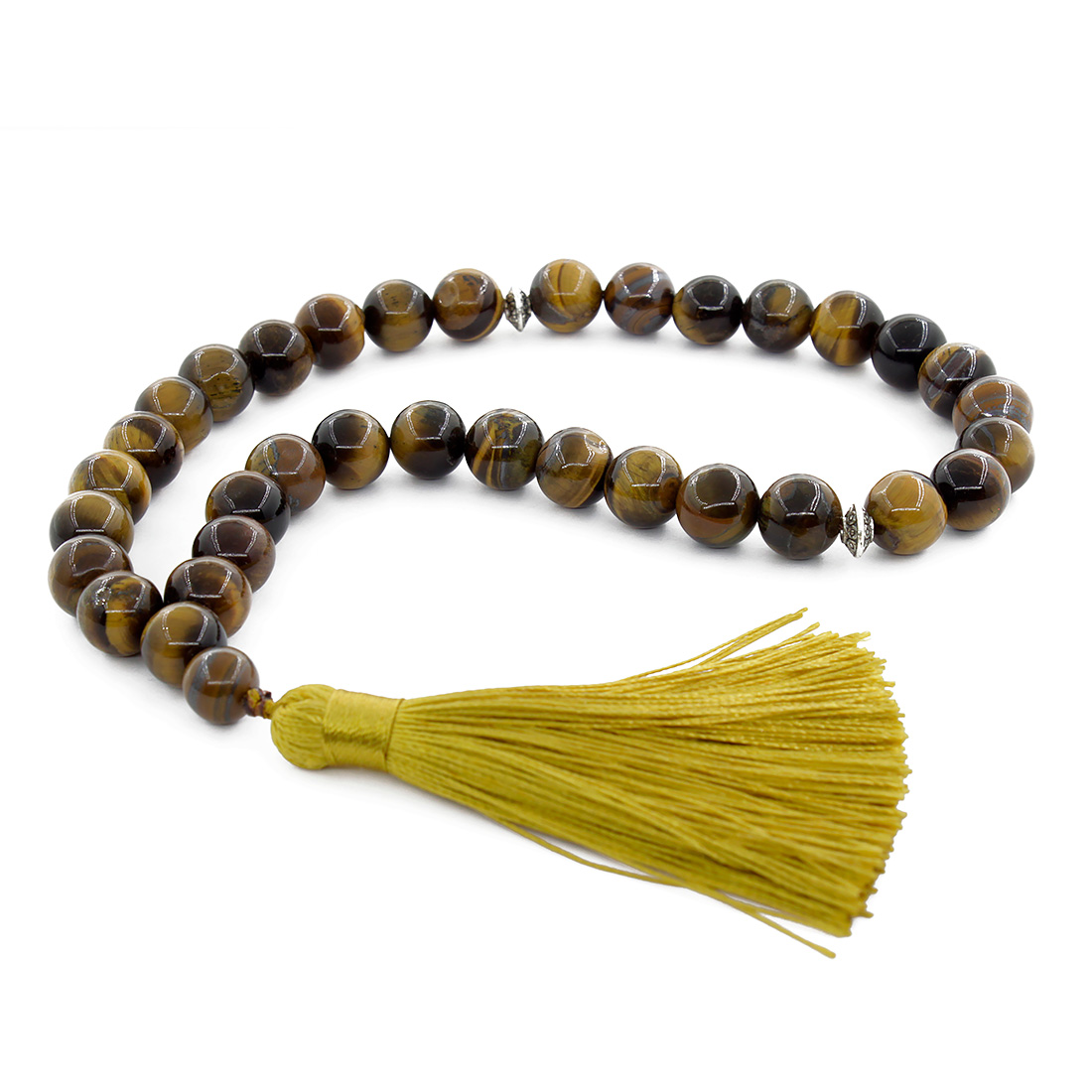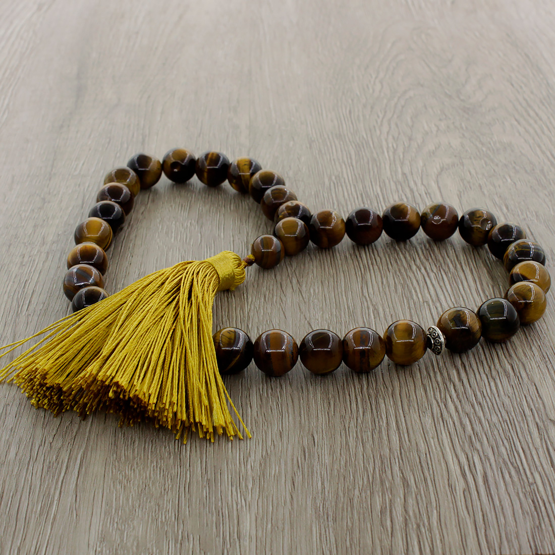 Четки из натурального камня тигровый глаз – 33 бусины + 2 бусины в хвосте. Диаметр бусин 12мм.
