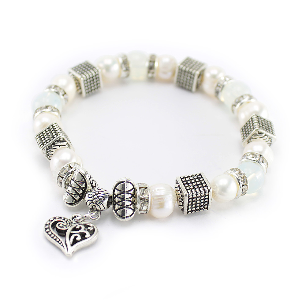 Браслет собран из натурального речного жемчуга, искусственного лунного камня и декоративных вставок. Примерная длина браслета 17см.