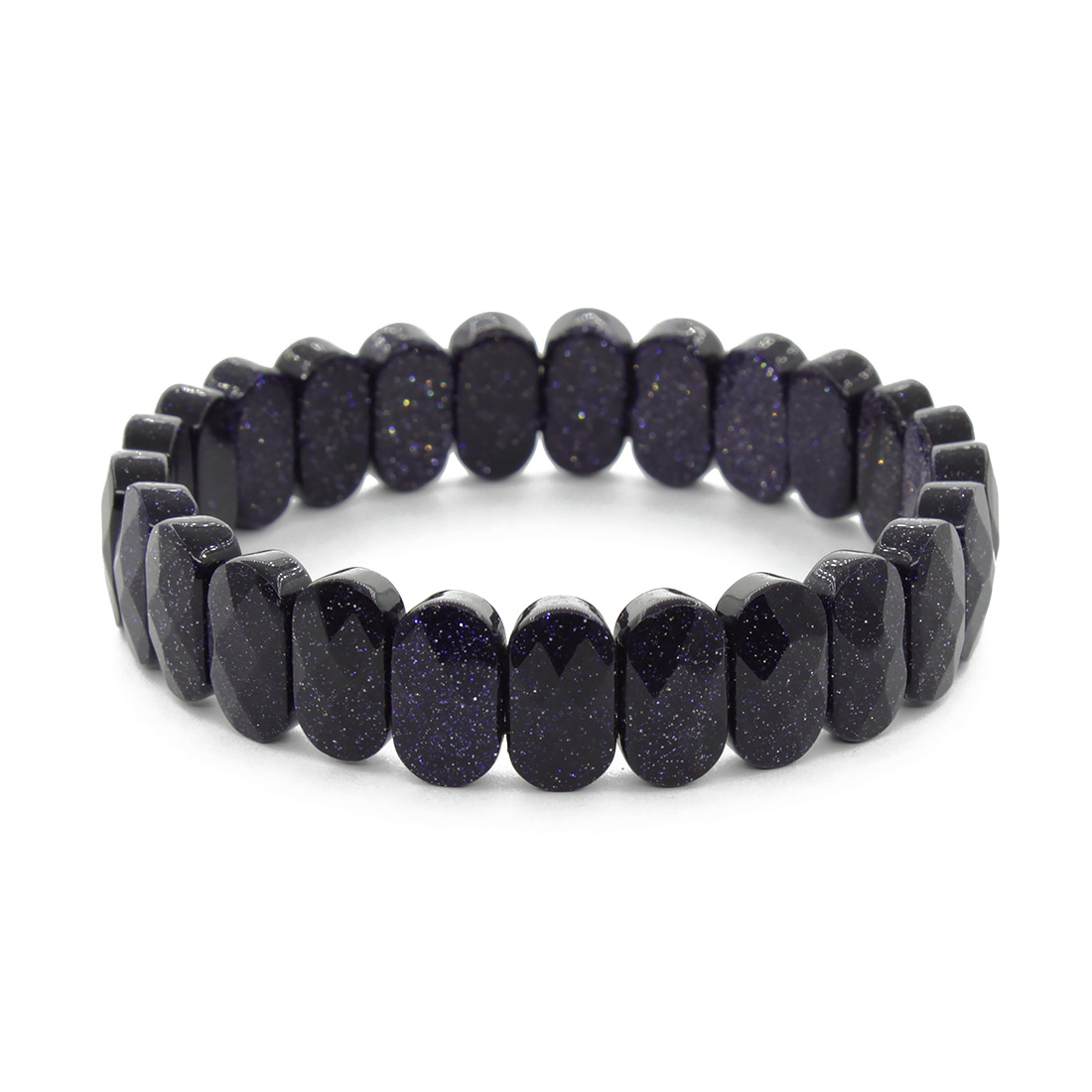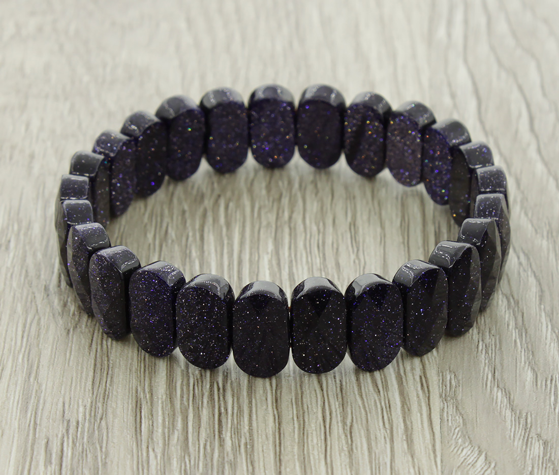 Браслет из мерцающиего тёмно-синего авантюрина с огранкой. Прочная резиновая нить позволяет с комфортом снимать и надевать украшение. Длина браслета 19см, ширина 14мм.