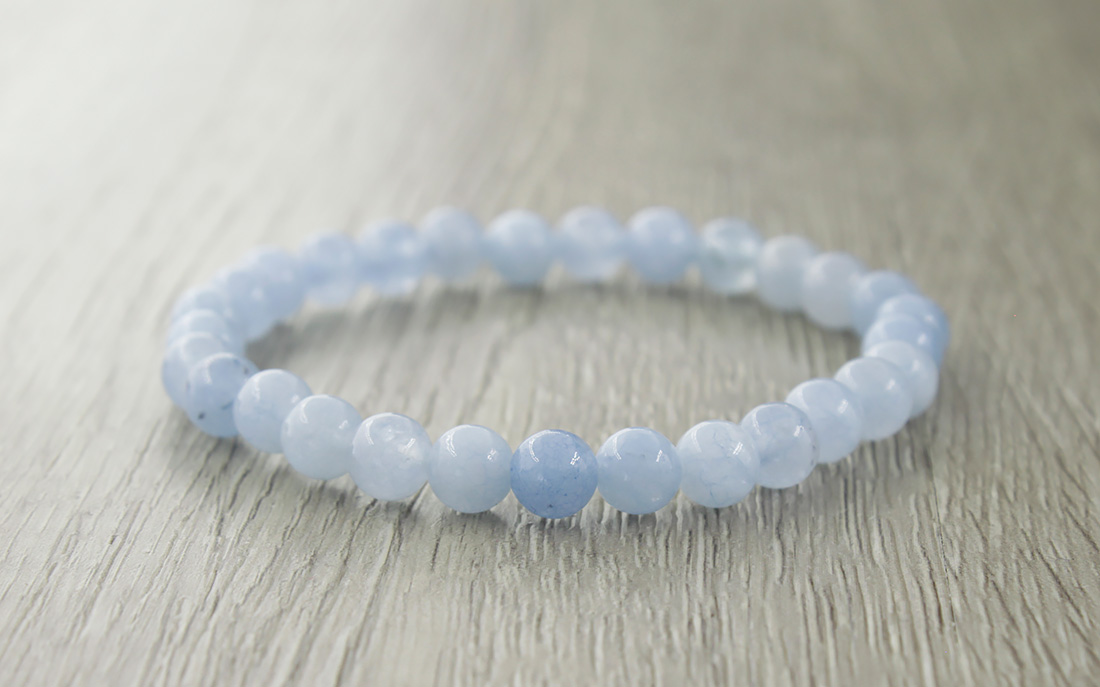 Нежный браслет из голубого кварца на резинке. Диаметр бусин 6мм. Длина украшения 18см.