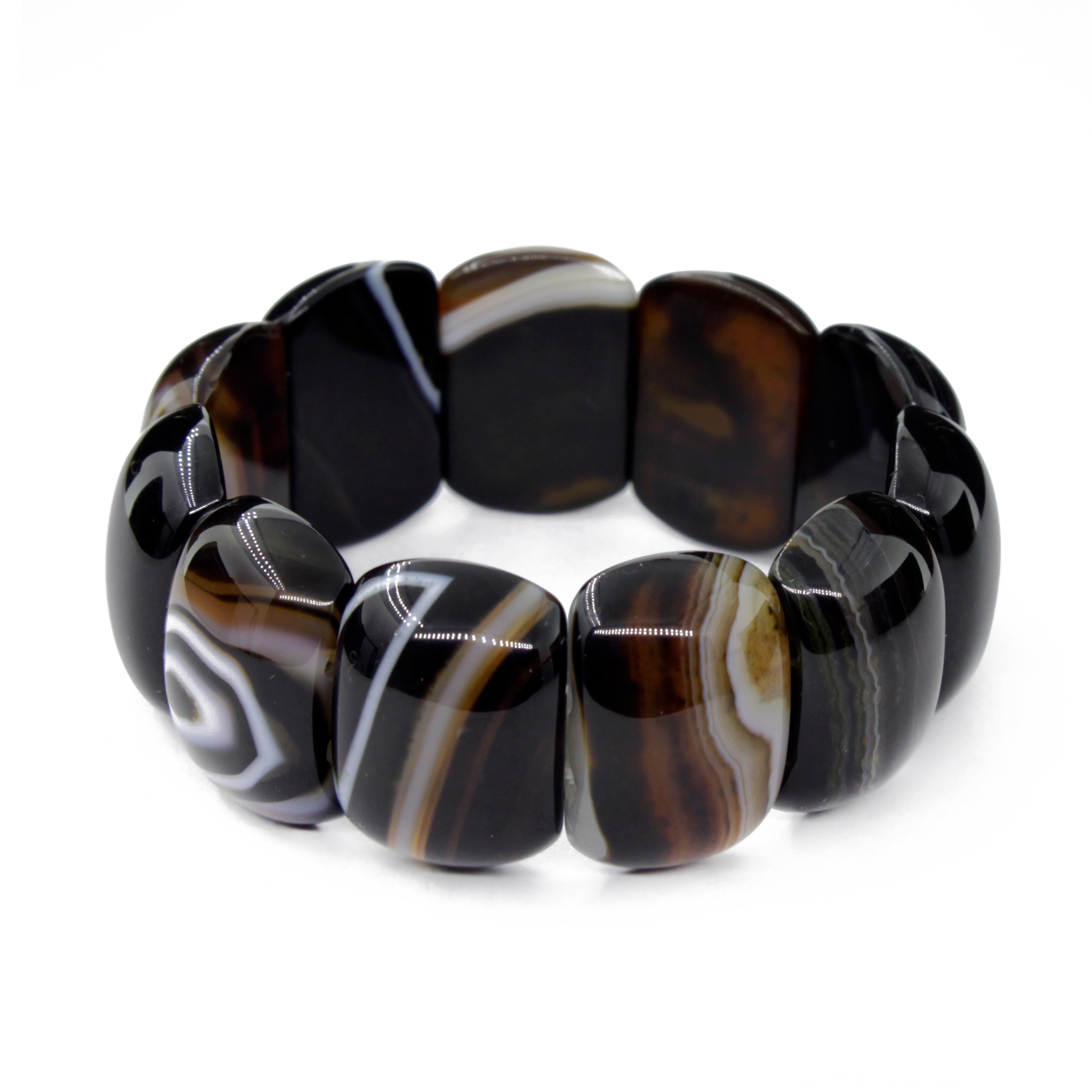 Массивный браслет на резинке выполнен из натурального агата с идеальной полировкой и ярким блеском. Длина браслета 21см, ширина 25мм. Рисунок на камне может немного отличаться от фото.