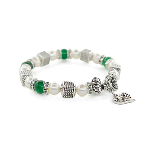 Браслет собран из натурального речного жемчуга и разбавлен необычными вставками с подвеской "сердечко". Примерная длина браслета 17см