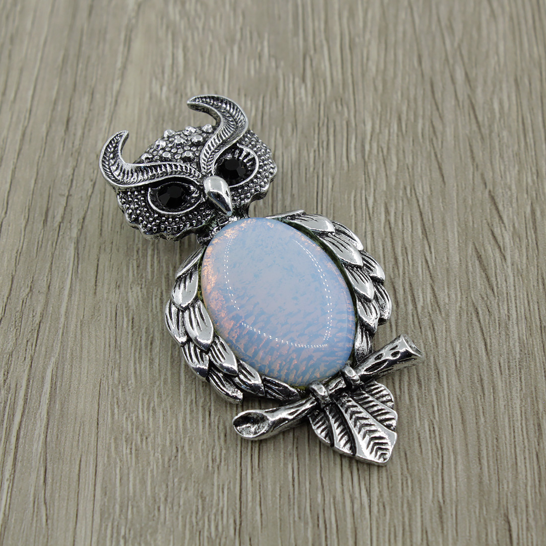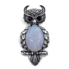 Брошь "Филин" выполнена из лунного камня и дополнительно украшена яркими стразами. Размер брошки 30х60мм.