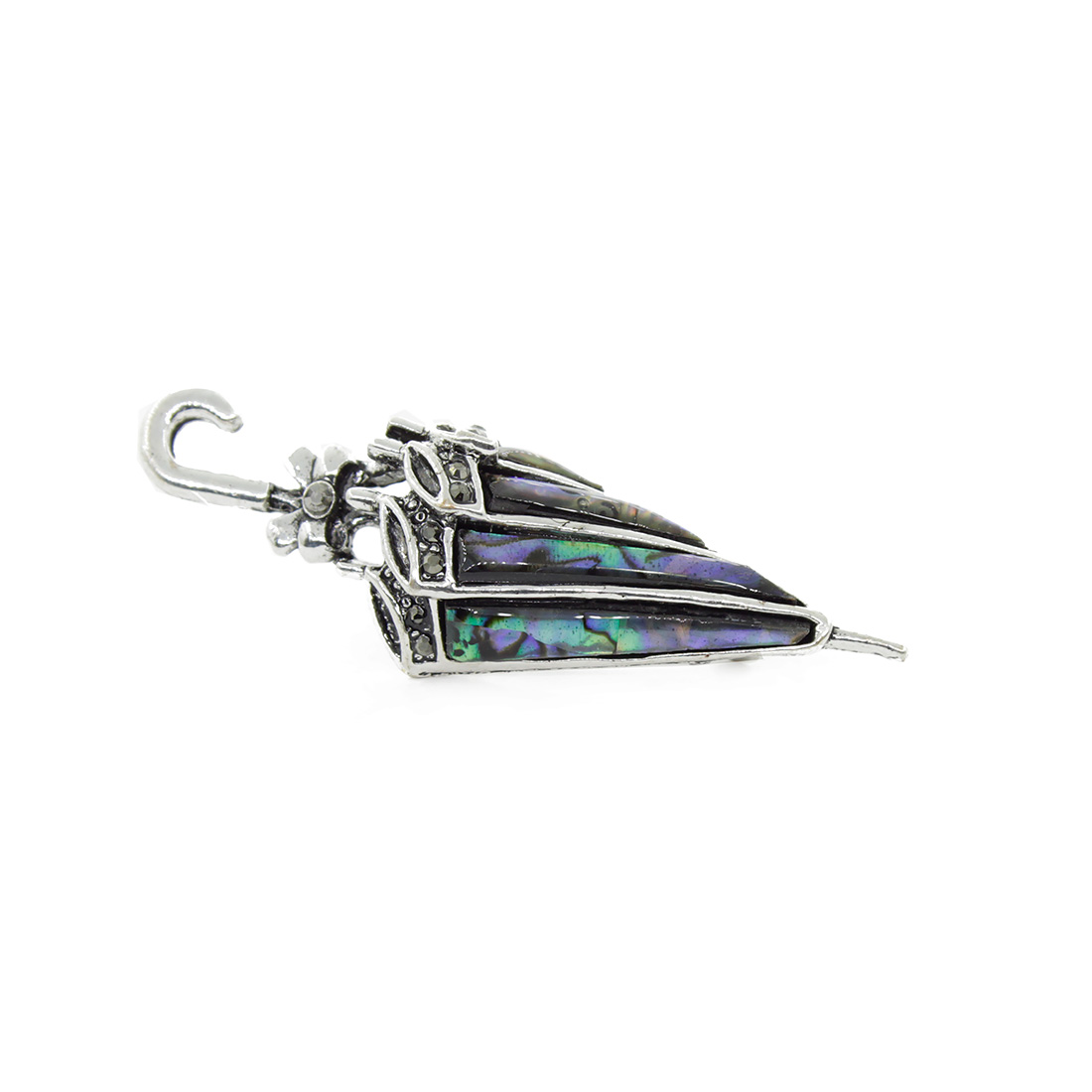 Изящная брошь в виде зонтика со вставками из гелиотиса. Размер броши 21х62мм.