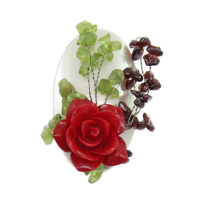 Брошь "Приморский сад" изготовлена из натурального белого перламутра, натурального граната и пренита. Размер брошки 35х55мм.