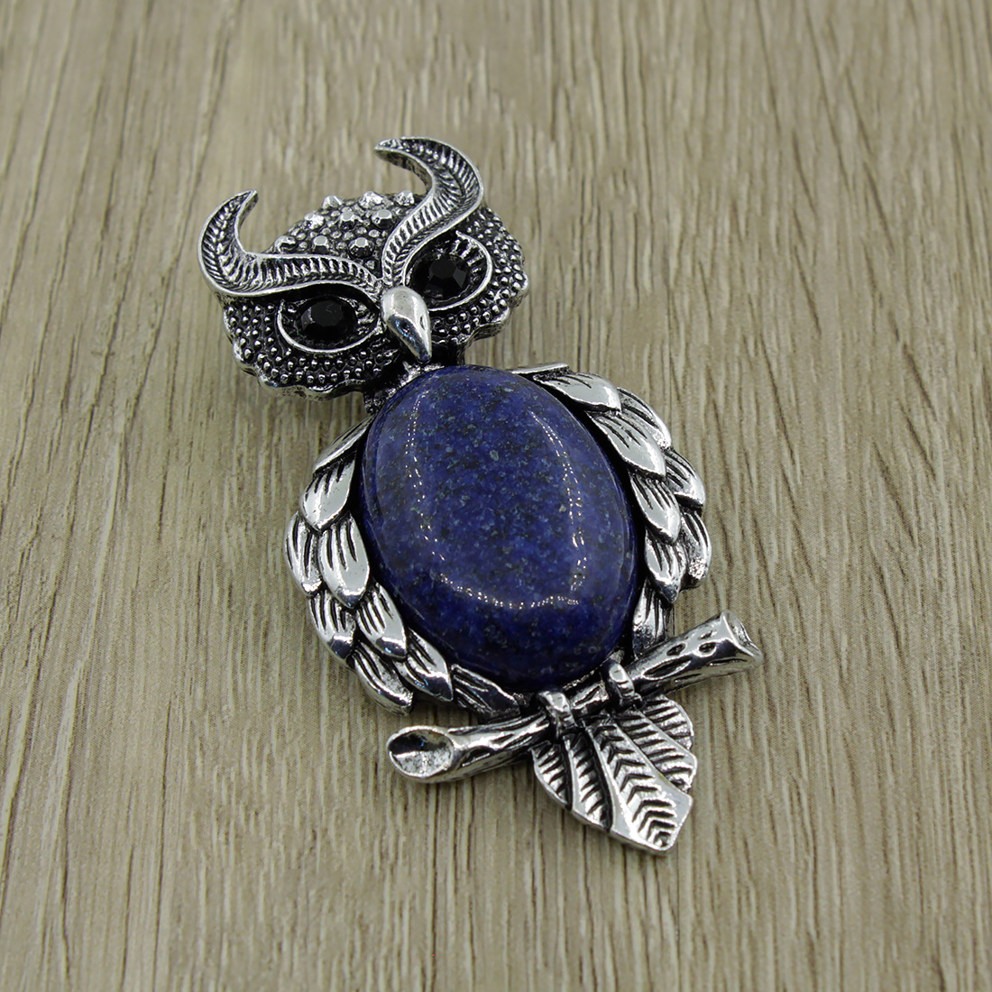 Брошь "Филин" выполнена из натурального лазурита и дополнительно украшена яркими стразами. Размер брошки 30х60мм.