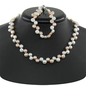Комплект Колье и браслет жемчуг mix бело-розовый, таблетки 2х, короткое 40см