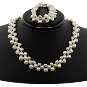 Это колье из белого, розового и темно-розовогожемчуга близко прилегает к шее и сморится очень нарядно. Длина колье 42см, а браслета 20см.