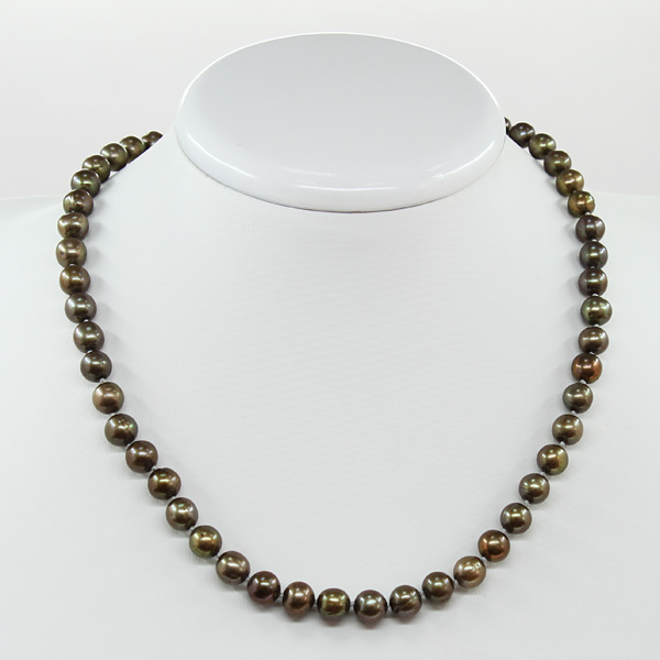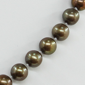 Эти бусы собраны из ровных жемчужин благородного коричневого цвета. Диаметр бусин 8мм, длина изделия 45см.
