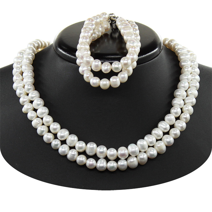 Колье и браслет белый жемчуг, ровный круглый 8мм, две нити, короткое 45см