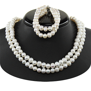 Жемчужное колье из двух нитей белоснежного жемчуга с красивым перламутровым блеском. В целом набор сморится очень изысканно и благородно. Диаметр жемчужин 8мм, длина колье 45см, браслета 20см.