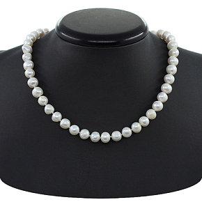 Жемчужины в этих бусах собраны на нитку через узелок, поэтому они ровно ложатся на шее. Диаметр бусин около 10мм, длина бус 49см.