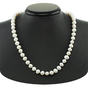 Классическое украшение - белая нитка жемчуга, подойдет в Вашему повседневному или праздничному образу. Диаметр жемчужин около 8мм, длина бус 46см