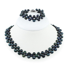 Колье и браслет жемчуг черный, форма таблетки 3х, короткое 42см