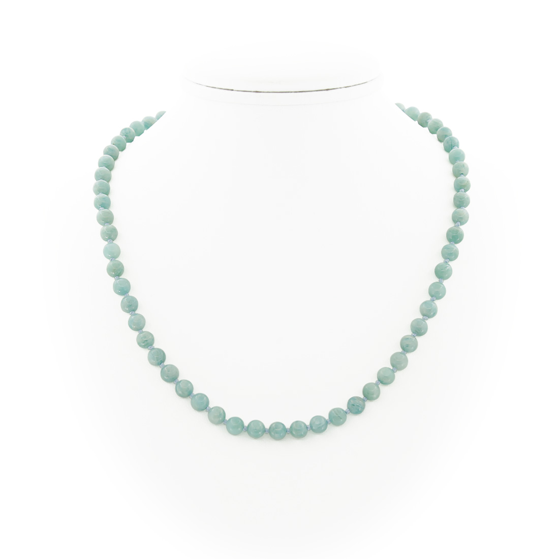 Бусы выполнены из натурального амазонита высокого качества. Украшение на нити, с узелками через каждую бусину и замком-карабином из ювелирного сплава. Диаметр бусин 8мм, длина бус 45см регулируется до 50см за счёт цепочки.