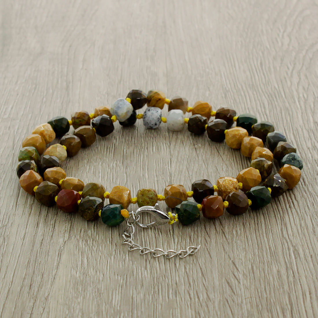 Изящные бусы из натуральной яшмы. В украшении используются бусины ручной огранки. Бусы собраны индийскими мастерами вручную. Длина 50см + удлинняющая цепочка 4см.
