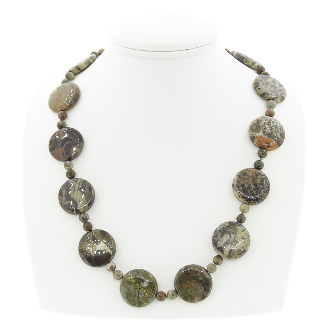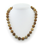 Эта яшма, добываемая на Урале, обладает необычайной смесью цветов в коричневых тонах. Диаметр плоских бусин 25мм, шариков - 6мм, длина изделия 56см.