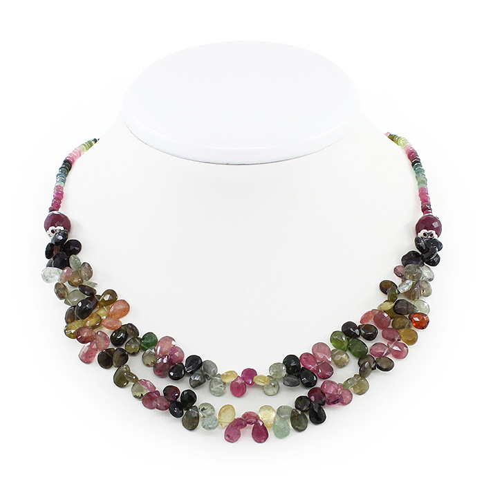 Изящное колье собрано из сочного и яркого турмалина высокого качества.Турмалин создает чувство покоя и благотворно воздействует на разум. Камни турмалина используют для концентрации во время медитаций. Колье собрано индийскими мастерами вручную, в нем используется замочек с серебрянным покрытием. Длина 43см.