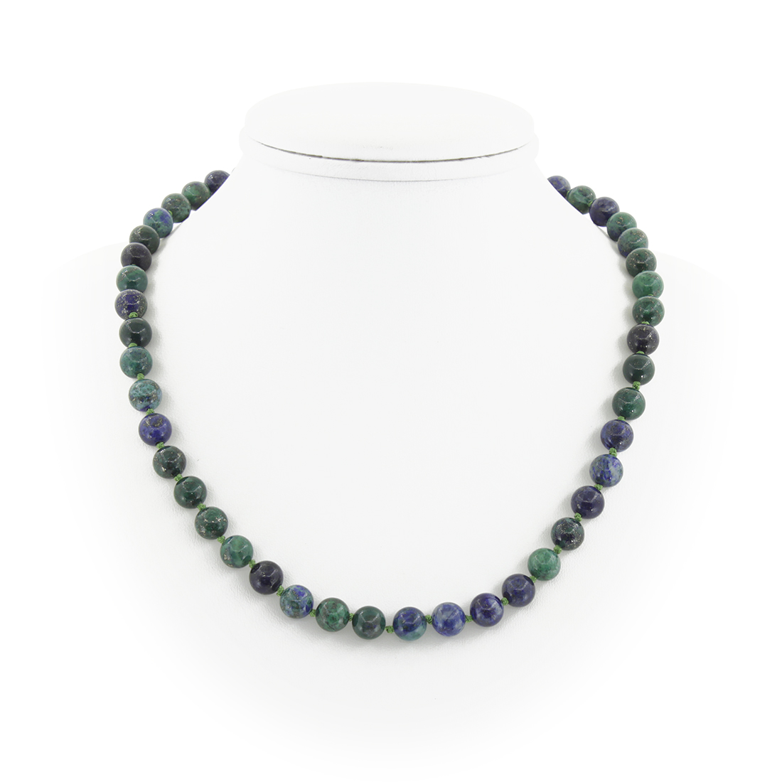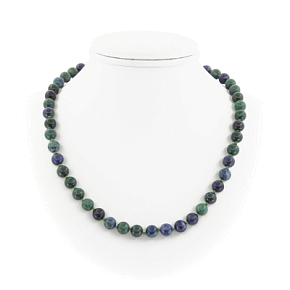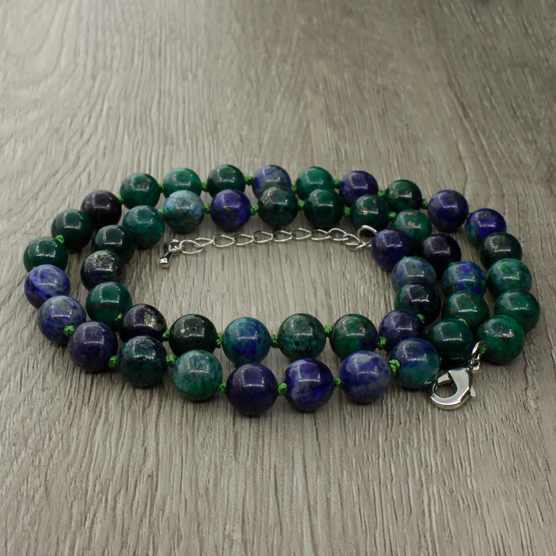 Оригинальные бусы из натурального азурита дополнят Ваш повседневный или праздничный образ. Украшение на нити, с узелками через каждую бусину и замком-карабином из ювелирного сплава. Диаметр бусин 8мм. Длина бус 45см, регулируется до 50см за счёт цепочки.