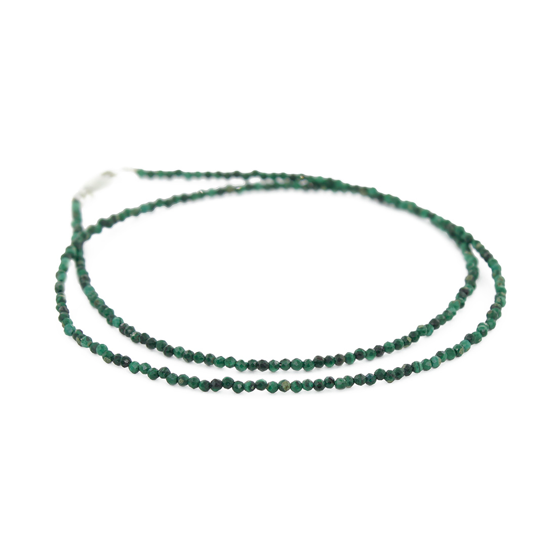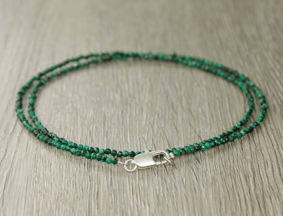 Это утончённое украшение собрано из граненых бусин натурального малахита. Размер бусин 2мм. Длина украшения 47см.