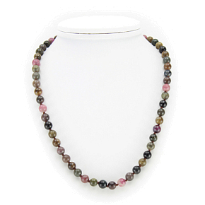 Бусы из натурального турмалина. Украшение на нити, с узелками через каждую бусину и замком карабином из ювелирного сплава. Диаметр бусин: 7мм. Длина бус: 46см, регулируется до 51см за счёт цепочки.