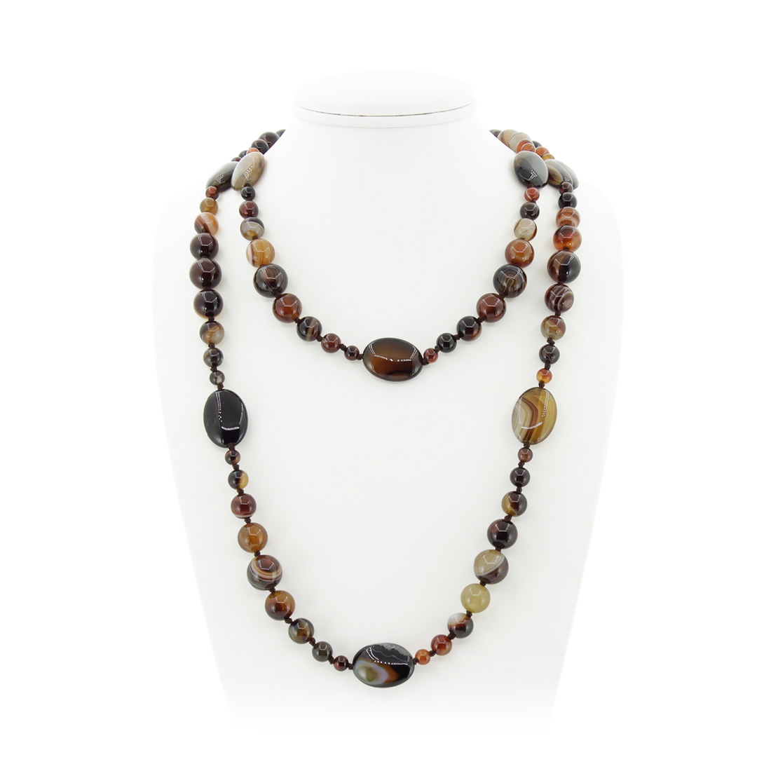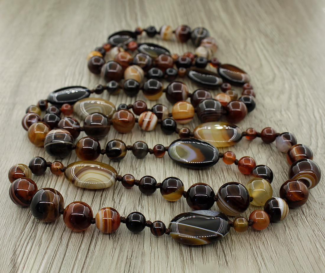 Агат черный и коричневый (Бразилия), разноразмерные круглые с плоскими овалами 18х25мм, бусы "Стихия", длина бус 128см